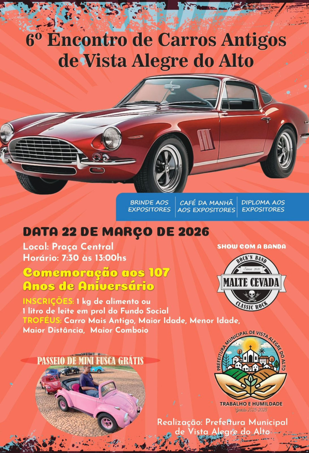 09/03/2026 - Vista Alegre do Alto recebe o 6º Encontro de Carros Antigos no mês de março.