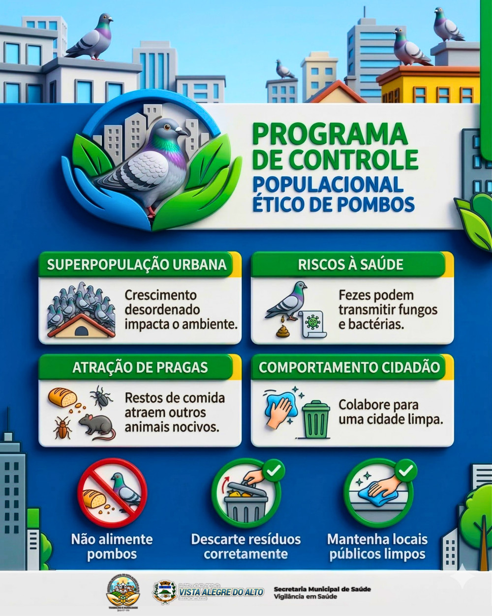 10/03/2026 - Prefeitura orienta população sobre controle populacional ético de pombos.