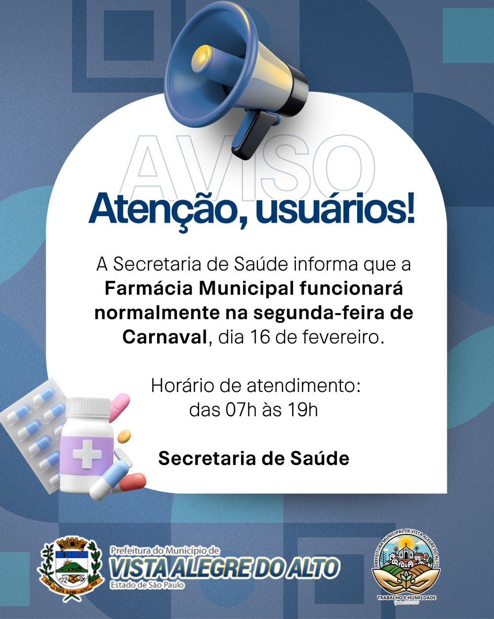 A Secretaria de Saúde informa que a Farmácia Municipal manterá o atendimento normal na segunda-feira de Carnaval, 16 de fevereiro.