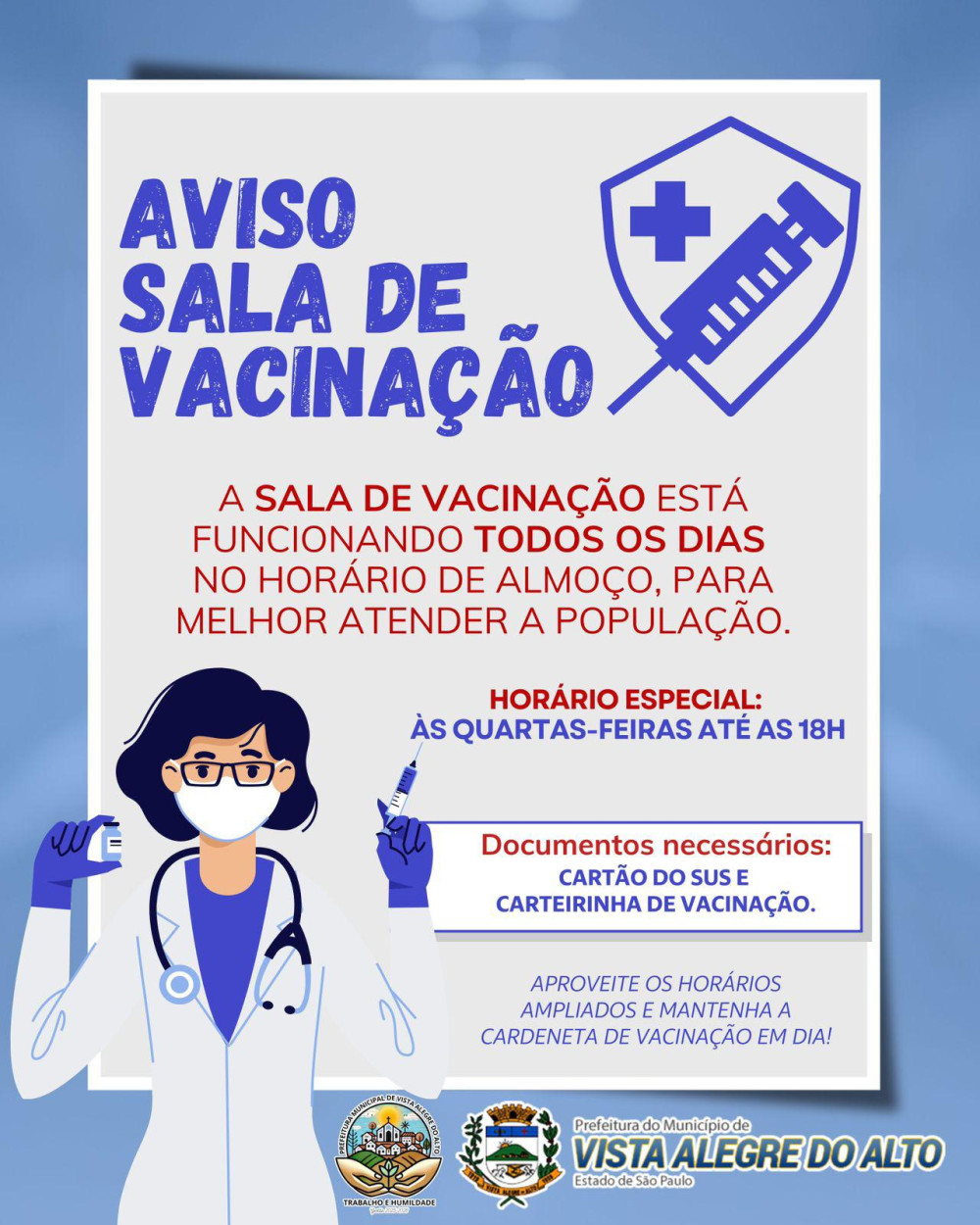 A sala de vacinação está funcionando todos os dias, inclusive no horário de almoço, para melhor atender a nossa população!