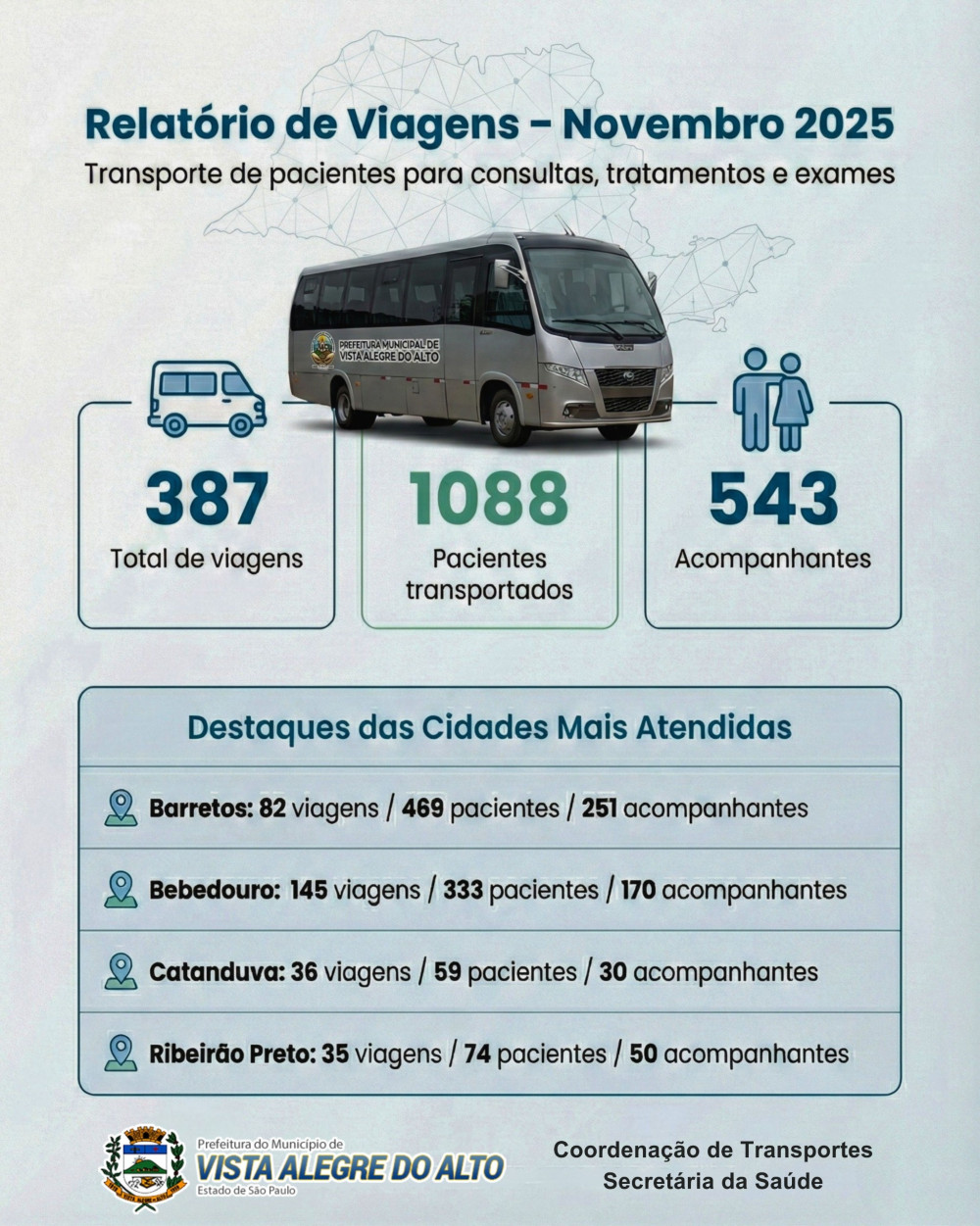 A Prefeitura de Vista Alegre do Alto, por meio da Secretaria Municipal da Saúde e do setor de Transporte de Pacientes, apresenta o balanço das viagens realizadas destacando o trabalho contínuo em garantir que munícipes tenham acesso seguro e organizado a consultas, exames e tratamentos em diversas cidades da região.
