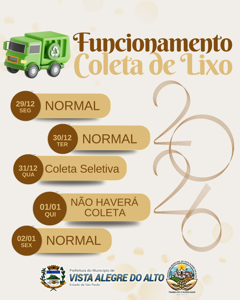 A Prefeitura Municipal de Vista Alegre do Alto informa à população a programação da coleta de lixo durante a semana do Ano Novo, conforme segue: