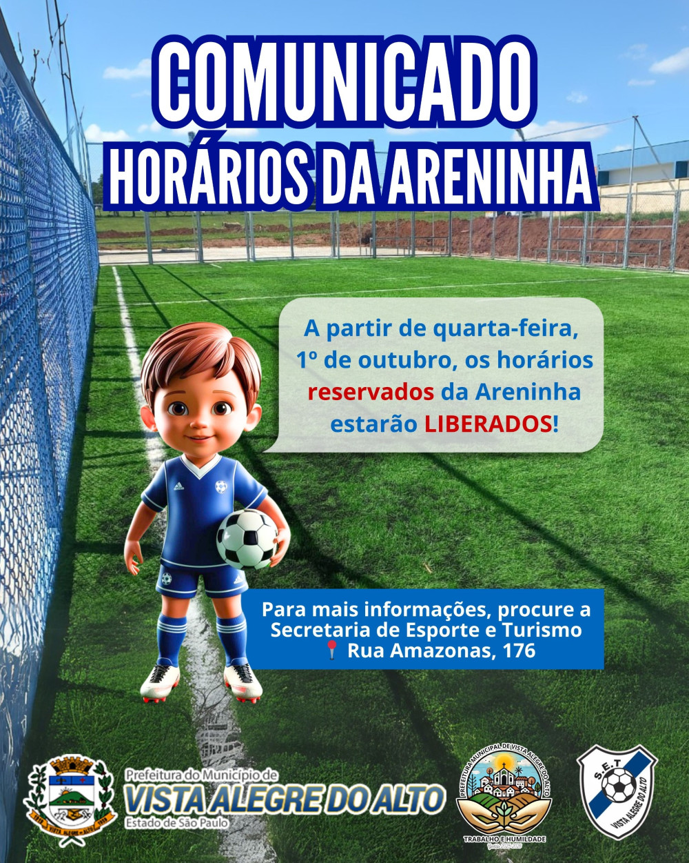 A Prefeitura Municipal de Vista Alegre do Alto, por meio da Secretaria de Esportes e Turismo, informa que o Campo de Futebol Society – Areninha “Cássio Antônio Aidar”, localizado na Rua Herculano do Livramento, 317, está disponível para uso da comunidade com seus devidos agendamentos.