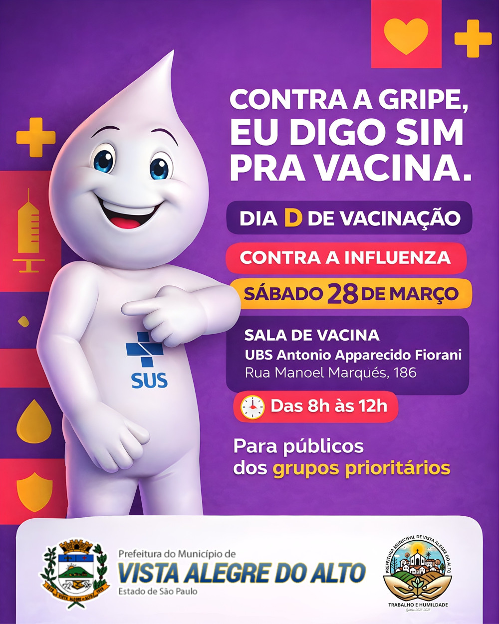 Neste sábado, 28 de março, será realizado o Dia D de vacinação contra a influenza, com o objetivo de ampliar a cobertura vacinal e proteger a população contra o vírus da gripe.