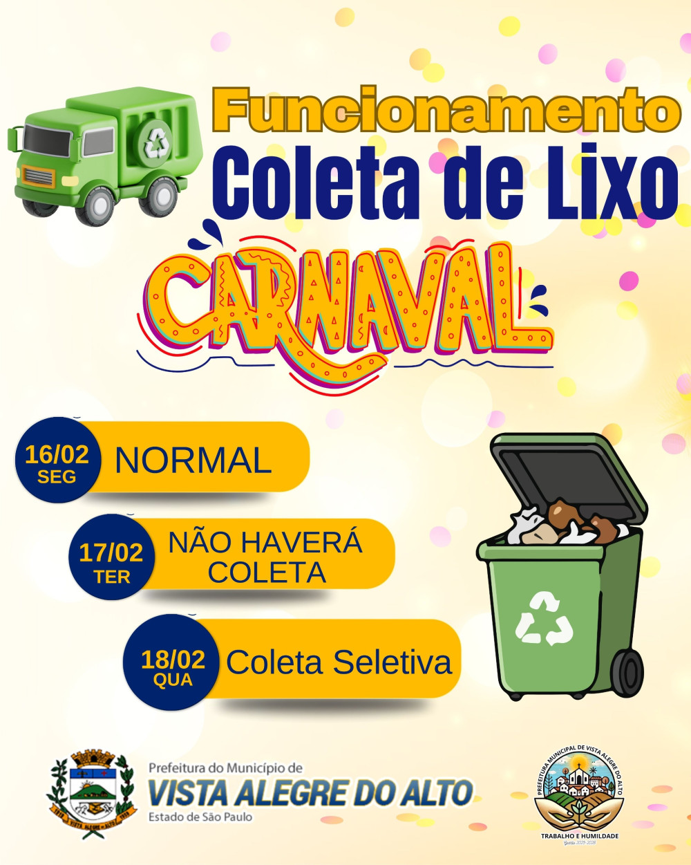 A Prefeitura de Vista Alegre do Alto informa à população sobre o funcionamento da coleta de lixo durante o feriado de Carnaval.