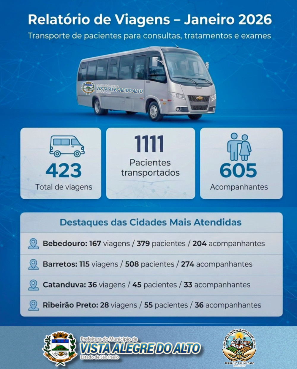 A Prefeitura de Vista Alegre do Alto, por meio da Secretaria Municipal de Saúde, divulgou o relatório das viagens realizadas durante o mês de janeiro de 2026, destinadas ao transporte de pacientes para consultas, tratamentos e exames médicos em outros municípios.