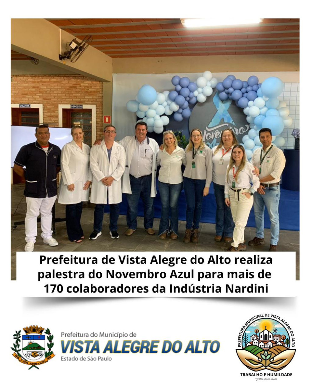 A Prefeitura de Vista Alegre do Alto, por meio da Secretaria Municipal de Saúde, promoveu nesta quinta-feira, 27, uma palestra voltada à campanha Novembro Azul na Indústria Nardini. A ação reuniu mais de 170 colaboradores e teve como foco a conscientização sobre a saúde do homem e a prevenção ao câncer de próstata.