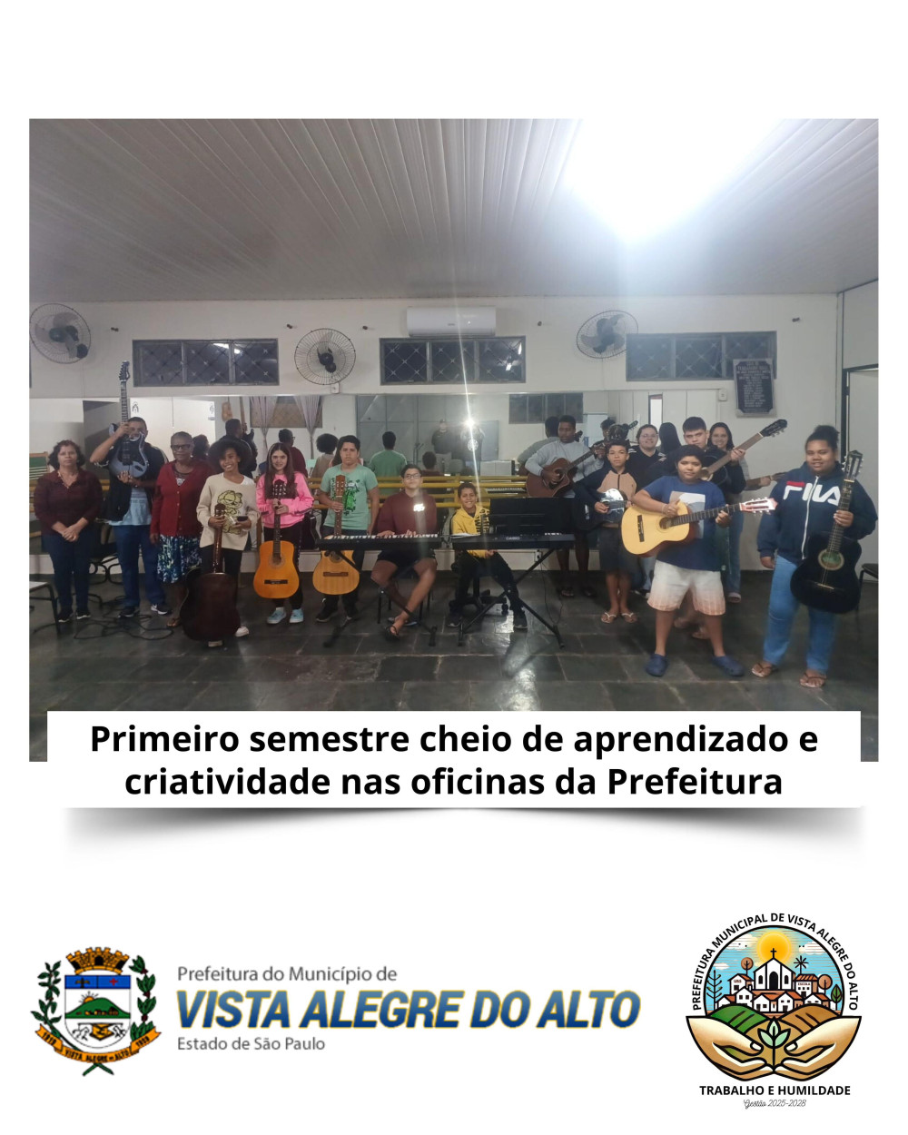 A Prefeitura de Vista Alegre do Alto, em parceria com a Secretaria de Educação celebram com entusiasmo o encerramento das oficinas do primeiro semestre de 2025. As atividades oferecidas gratuitamente à população — Violão, Bordado, Capoeira e Corte e Costura — foram um verdadeiro sucesso e movimentaram a cidade com aprendizado, criatividade e inclusão social.