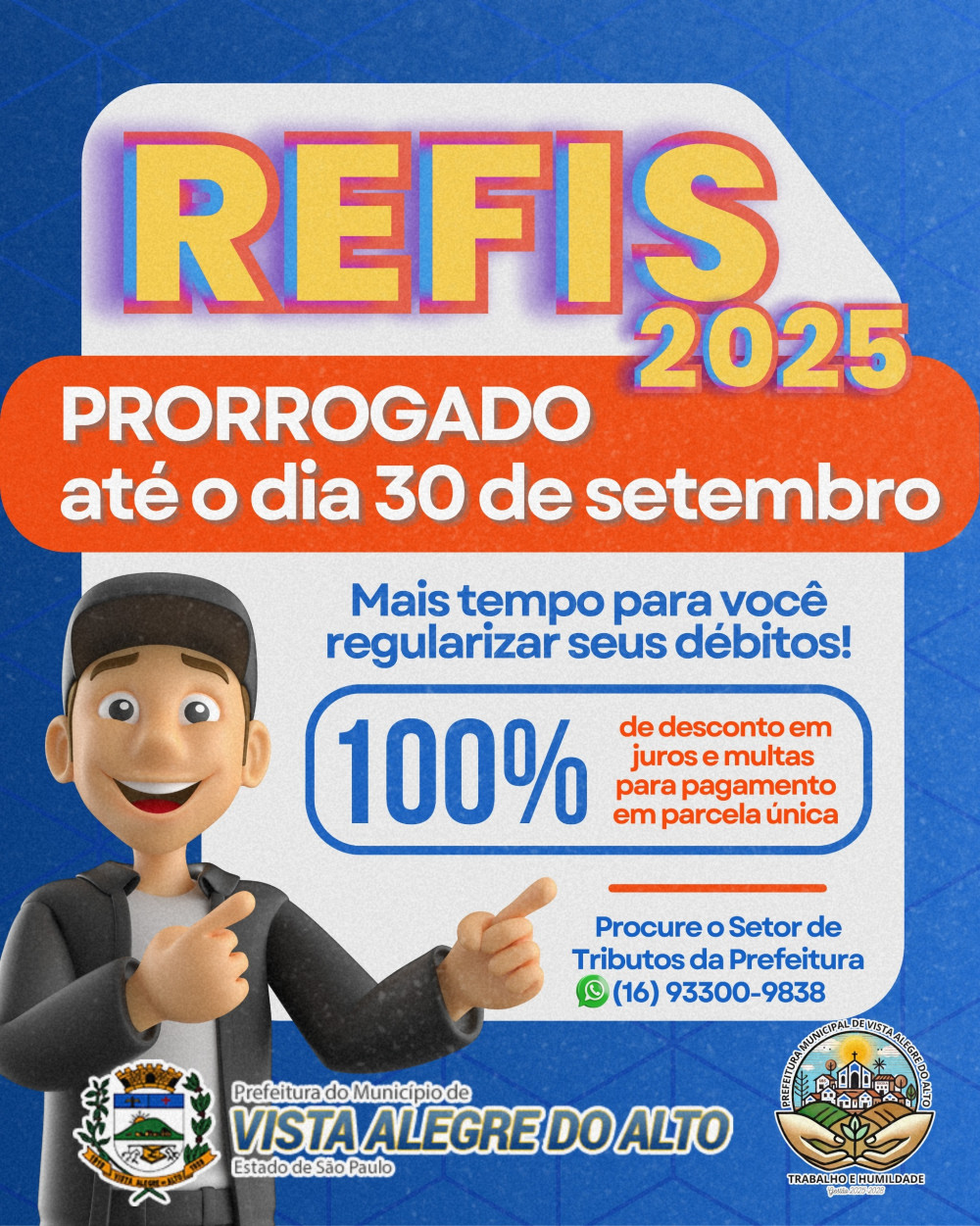 A Prefeitura de Vista Alegre do Alto informa que foi aprovada a prorrogação do REFIS 2025 (Lei Complementar nº 214). Agora, você tem até o dia 30 de setembro para aproveitar esta oportunidade!
