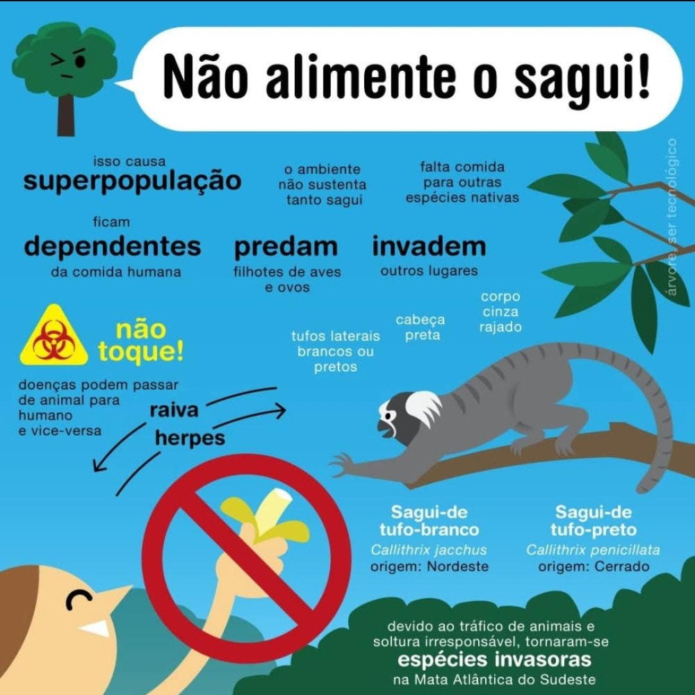 Pensando nisso, quando você encontrar um sagui não o alimente, exceto quando se fizer necessário devido às condições em que o animal se encontra, pois isso pode causar superpopulação, tornando-o dependente de comida humana e propiciando condições de invasão em novas áreas urbanas.