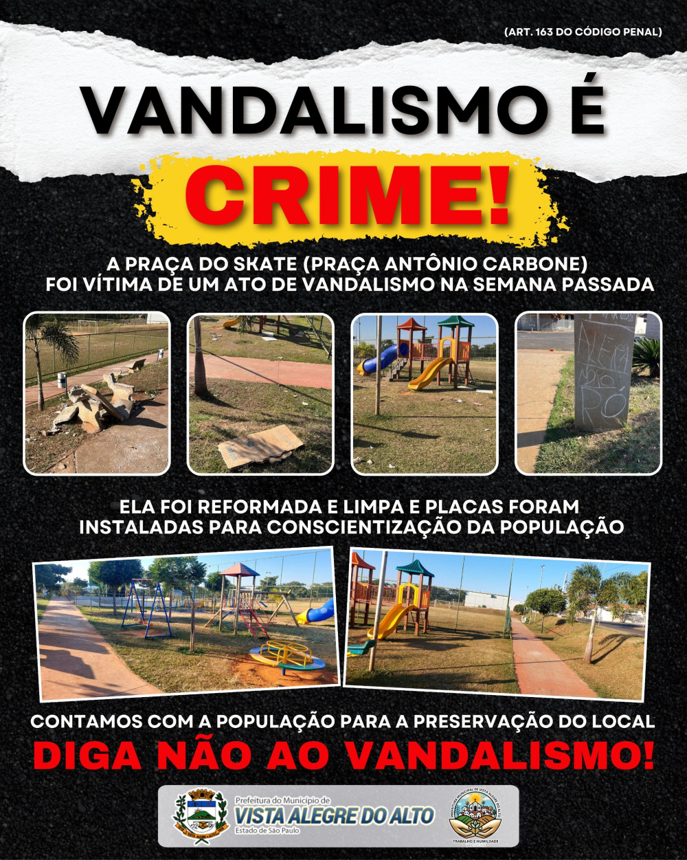 Na última semana, a “Praça Antônio Carbone”, conhecida como Praça do Skate, foi alvo de um lamentável ato de vandalismo. O local foi pichado, teve estruturas depredadas e foi tomado por lixo. Um espaço público, pensado para o lazer, o esporte e a convivência da nossa população, foi desrespeitado de forma inaceitável.