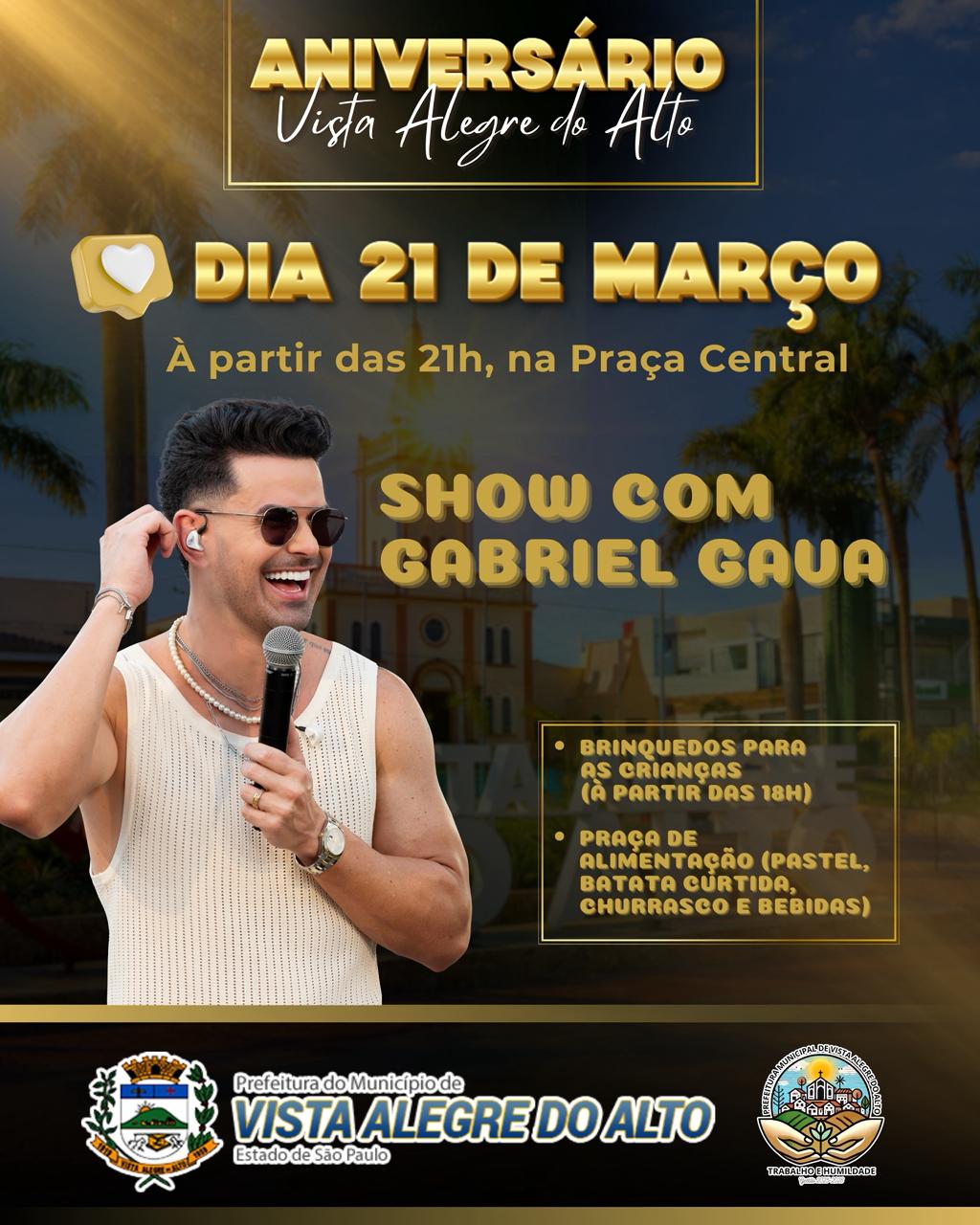 No dia 21 de março, a partir das 21h, a praça central recebe show com o cantor Gabriel Gava. Além da apresentação musical, haverá brinquedos para as crianças (à partir das 18h) e praça de alimentação com pastel, batata curtida, churrasco e bebidas, oferecendo uma opção de lazer para toda a família.