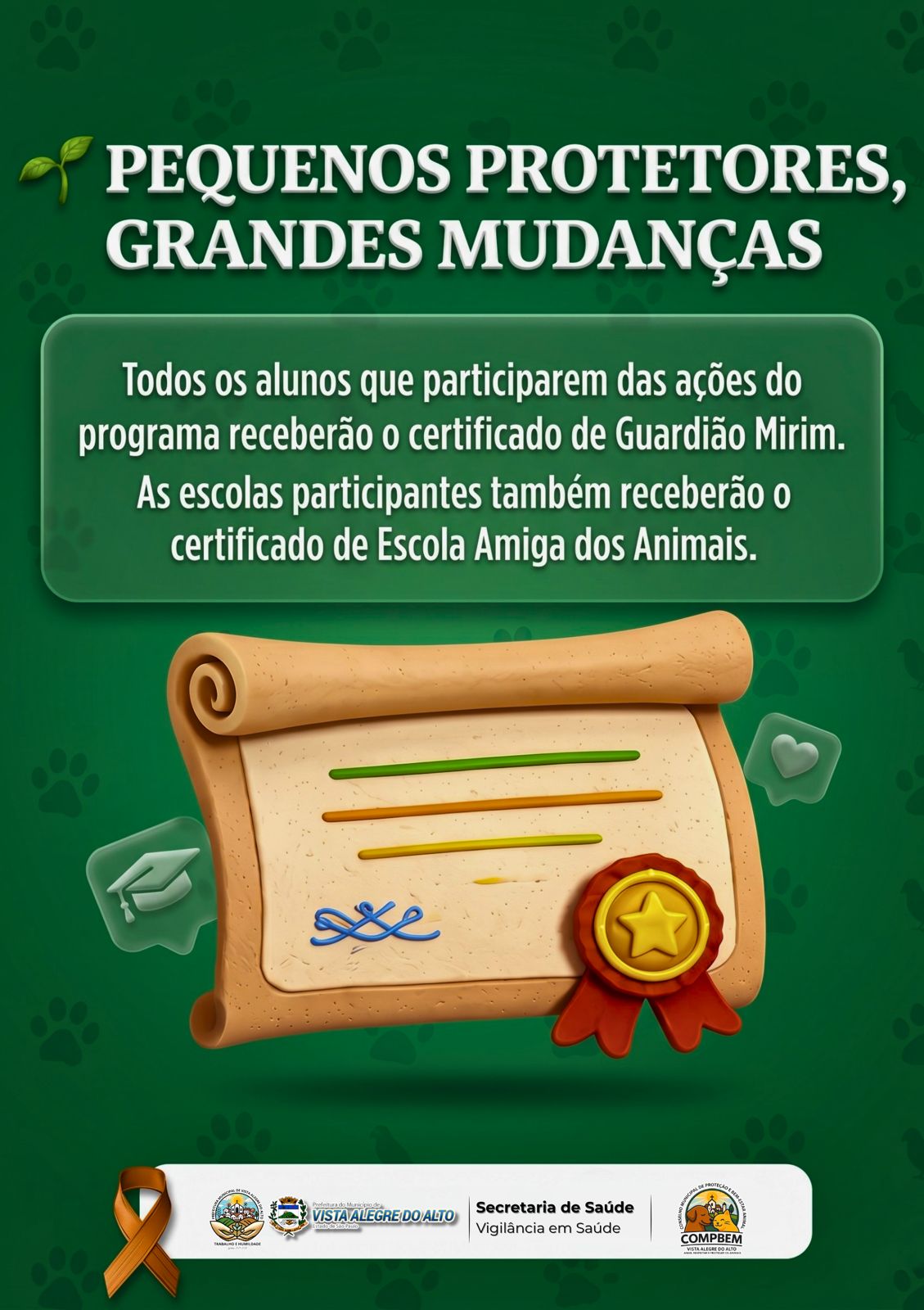 Na próxima semana, uma ação especial será realizada nas unidades escolares do município. Durante as atividades, os alunos participarão de orientações sobre maus-tratos, cuidados adequados e a importância da proteção animal, de forma educativa e acessível.