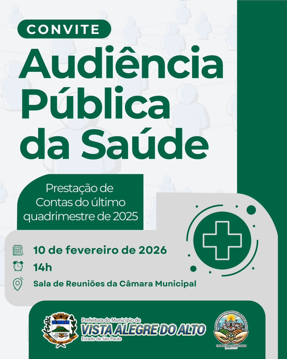 A Prefeitura de Vista Alegre do Alto realizará, no dia 10 de fevereiro de 2026, às 14h, a Audiência Pública da Saúde, na Sala de Reuniões da Câmara Municipal.