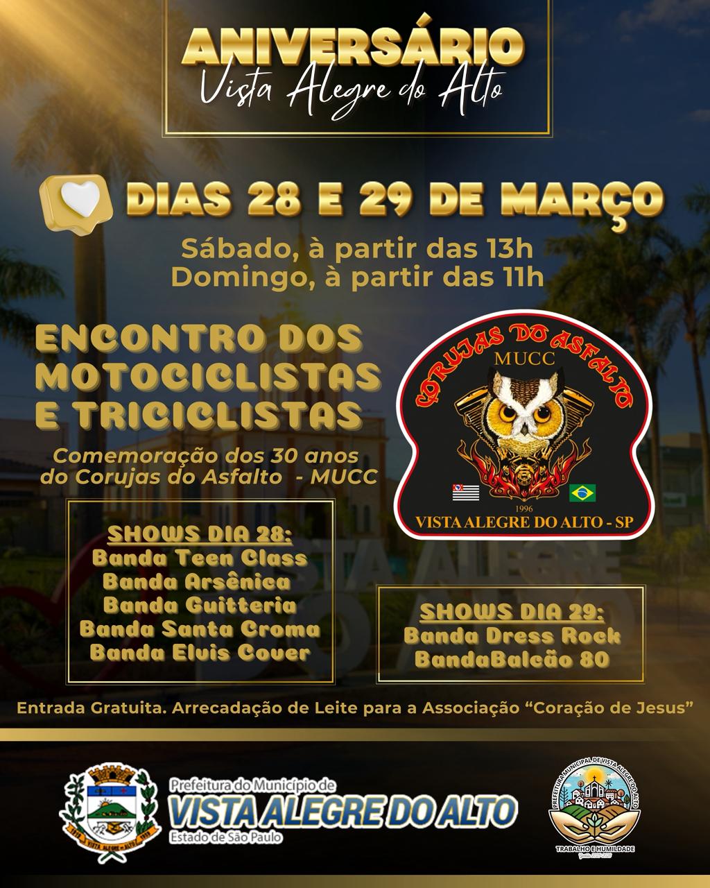 Encerrando as festividades, nos dias 28 e 29 de março, acontece o Encontro de Motociclistas e Triciclistas em comemoração aos 30 anos do grupo Corujas do Asfalto - MUCC. No sábado, 28, as atividades começam às 13h, com apresentações das bandas Teen Class, Arsênica, Guitteria, Santa Croma e Elvis Cover. No domingo, 29, a programação tem início às 11h, com shows das bandas Dress Rock e Balcão 80, além da tradicional bênção dos motociclistas.