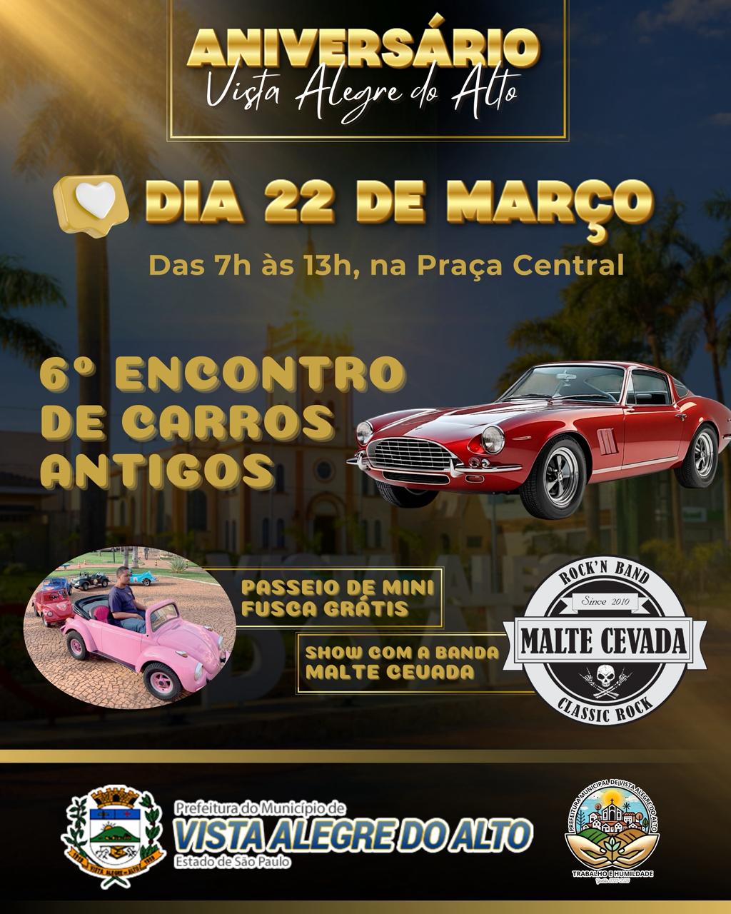 No domingo, dia 22 de março, das 7h30 às 13h, será realizado o 6º Encontro de Carros Antigos de Vista Alegre do Alto, na Praça Central