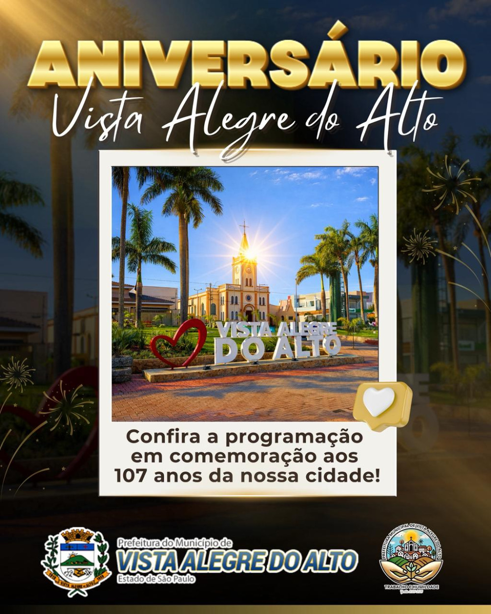 O município de Vista Alegre do Alto celebra no dia 25 de março seus 107 anos. Para marcar a data, a Prefeitura Municipal organizou uma programação especial que se estende por todo o mês de março, reunindo esporte, cultura, música e ações solidárias voltadas à população.